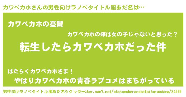 | 女子向けラノベタイトル風あだ名 | 『婚約破棄系悪役カワベカホに転生したので、保身に走りました。』 |