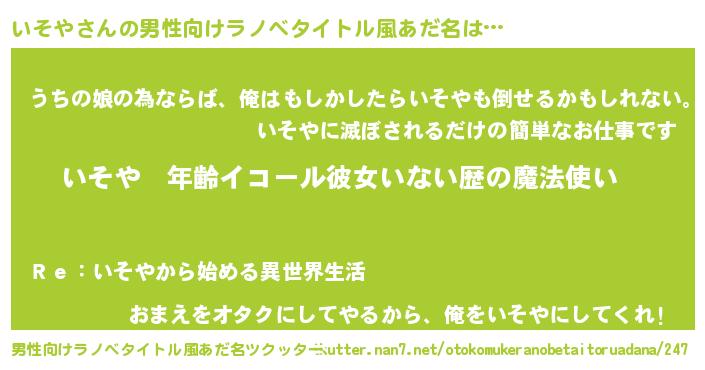 | 女子向けラノベタイトル風あだ名 | 『いそやの玉の輿計画!』 |