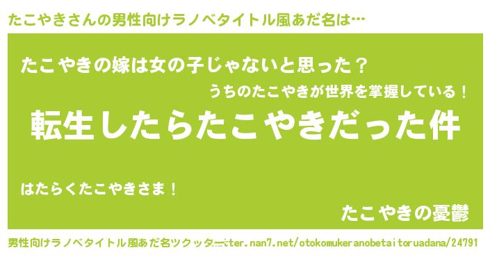 | 女子向けラノベタイトル風あだ名 | 『たこやきの玉の輿計画!』 |