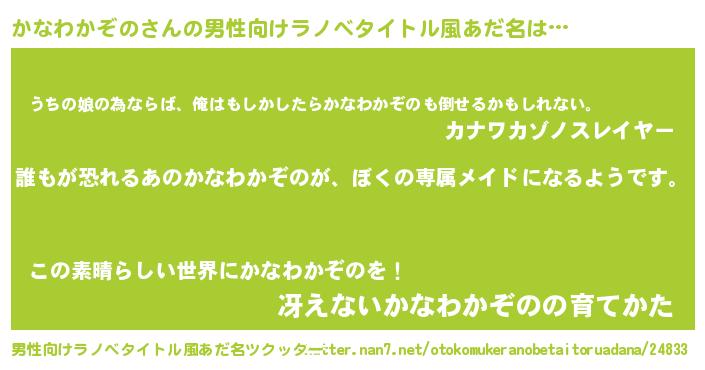 | 胡散臭い通販商品みたいなあだ名 | 『来世でも幸せになれる健康食品…その名も「かなわかぞの」』 |