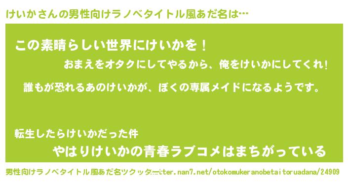 | 女子向けラノベタイトル風あだ名 | 『異世界でカフェけいかを開店しました。』 |