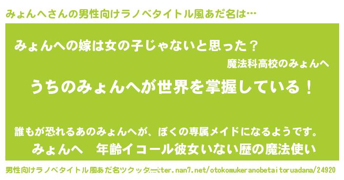 | 胡散臭い通販商品みたいなあだ名 | 『全米が絶賛したサプリメント…その名も「みょんへ」』 |