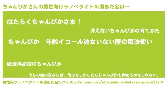 | 女子向けラノベタイトル風あだ名 | 『ちゃんぴかの玉の輿計画!』 |