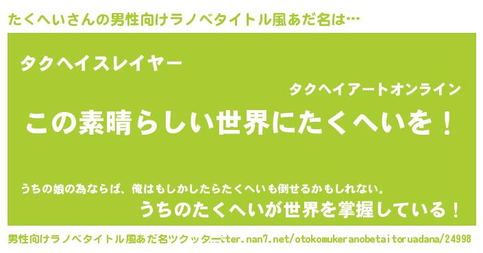 | 女子向けラノベタイトル風あだ名 | 『悪役たくへいに転生したようですが、知った事ではありません』 |
