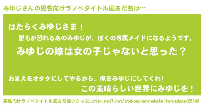 | 欧米人風あだ名 | 『ウサインみゆじ』『アンジェラ・みゆじ』 |