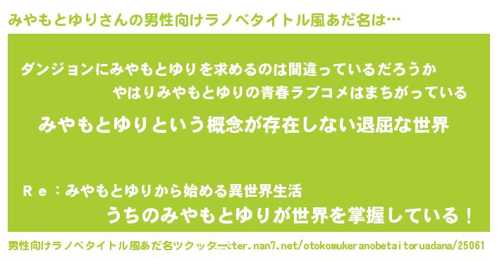 | 女子向けラノベタイトル風あだ名 | 『異世界で失敗しない100のみやもとゆり』 |