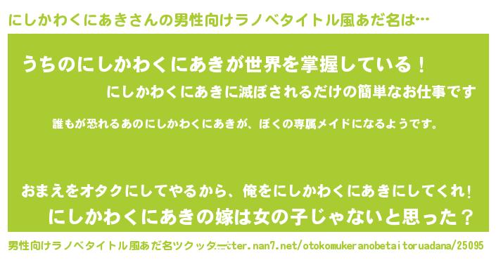 | 女子向けラノベタイトル風あだ名 | 『にしかわくにあきの契約王妃』 |