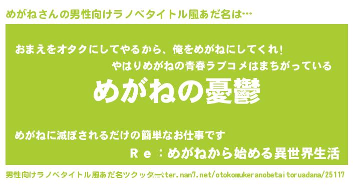 | 女子向けラノベタイトル風あだ名 | 『めがね姫と円卓の騎士』『めがね恋絵巻』 |