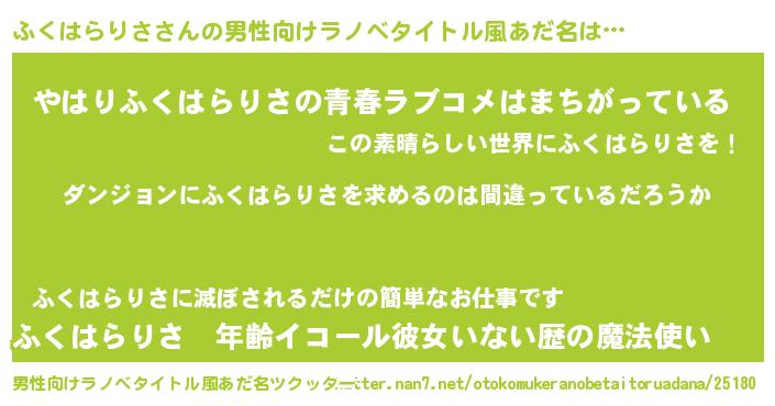 | 女子向けラノベタイトル風あだ名 | 『ふくはらりさの卵を拾いまして』 |