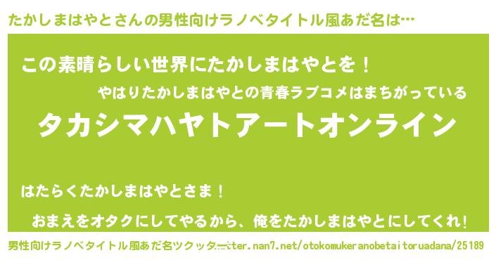 | 女子向けラノベタイトル風あだ名 | 『誰かこのたかしまはやとを説明してください! ~契約から始まるウェディング~』 |