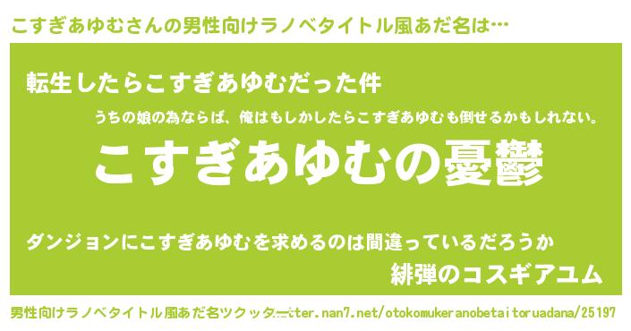 | 女子向けラノベタイトル風あだ名 | 『(仮)こすぎあゆむのやんごとなき事情』 |