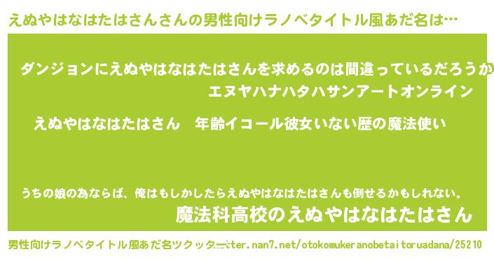 | 女子向けラノベタイトル風あだ名 | 『えぬやはなはたはさんの玉の輿計画!』 |