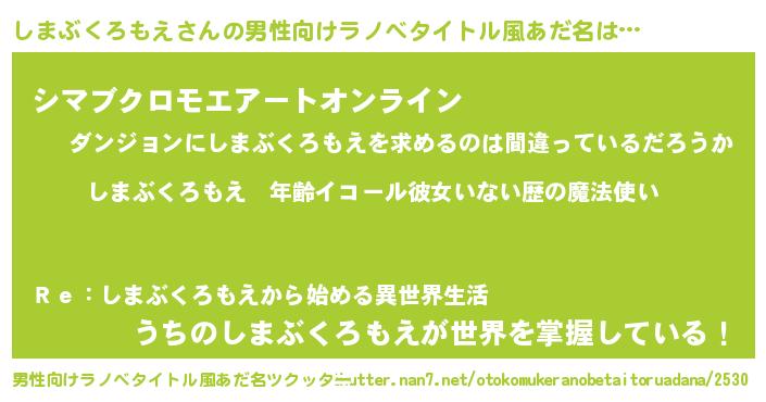 | 女子向けラノベタイトル風あだ名 | 『しまぶくろもえの玉の輿計画!』 |