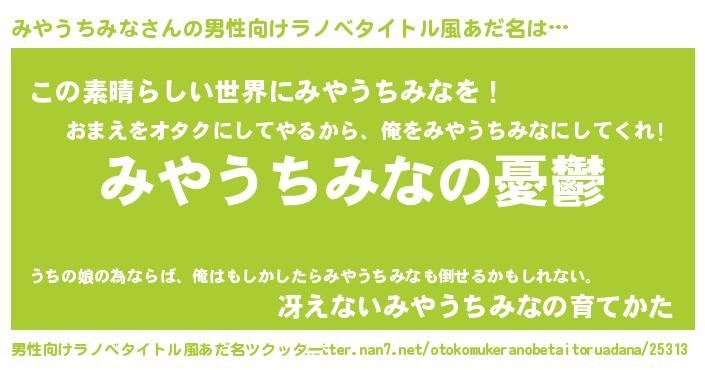 | 女子向けラノベタイトル風あだ名 | 『(仮)みやうちみなのやんごとなき事情』 |