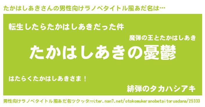 | 女子向けラノベタイトル風あだ名 | 『(仮)たかはしあきのやんごとなき事情』 |