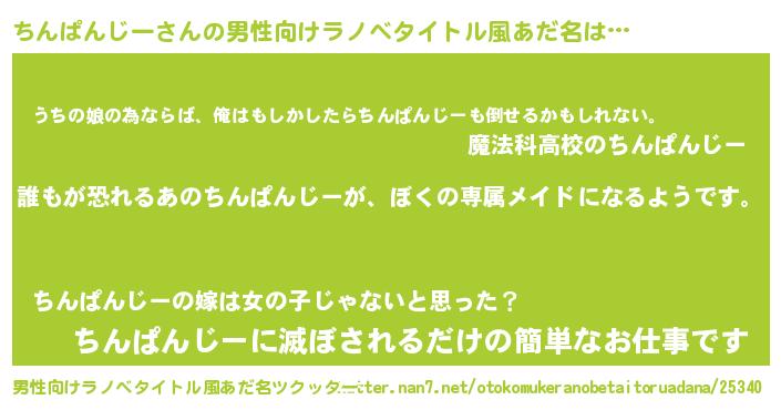 | 女子向けラノベタイトル風あだ名 | 『異世界でカフェちんぱんじーを開店しました。』 |