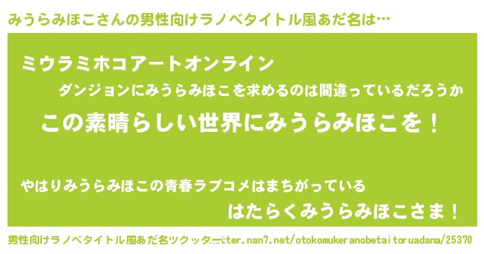 | 女子向けラノベタイトル風あだ名 | 『乙女ゲームの破滅フラグしかない悪役みうらみほこに転生してしまった…』 |