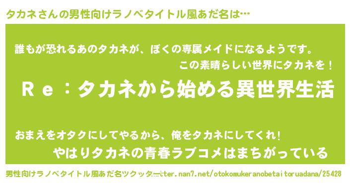 | 意味不明あだ名 | 『自称タカネ』『永久保存タカネ』 |