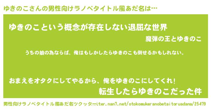 | 女子向けラノベタイトル風あだ名 | 『ゆきのこ伯爵の花嫁』『ゆきのこ恋絵巻』 |