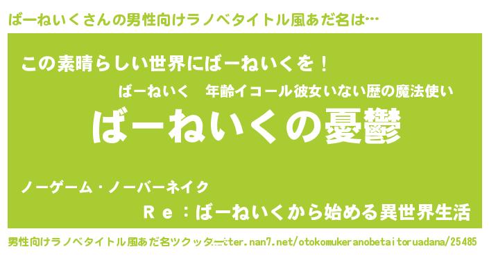 | 女子向けラノベタイトル風あだ名 | 『(仮)ばーねいくのやんごとなき事情』 |