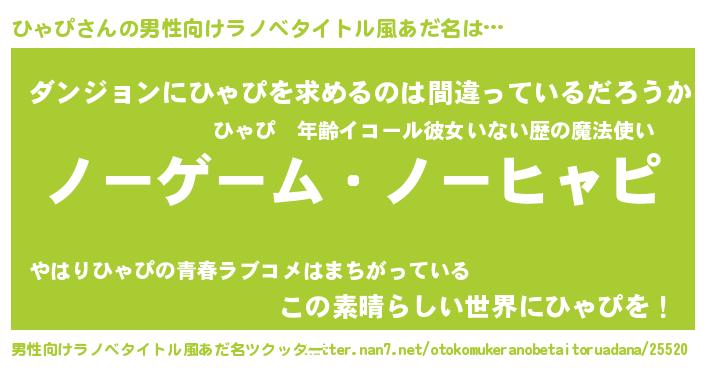 | 女子向けラノベタイトル風あだ名 | 『死神ひゃぴの再婚』 |