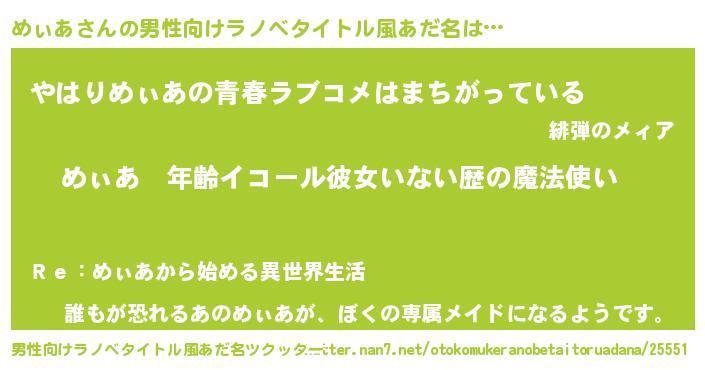| 女子向けラノベタイトル風あだ名 | 『めぃあの玉の輿計画!』『闇のめぃあ』 |