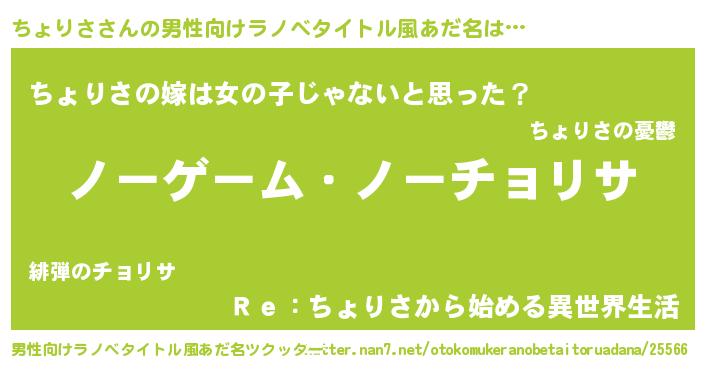 | 女子向けラノベタイトル風あだ名 | 『死神ちょりさの再婚』 |