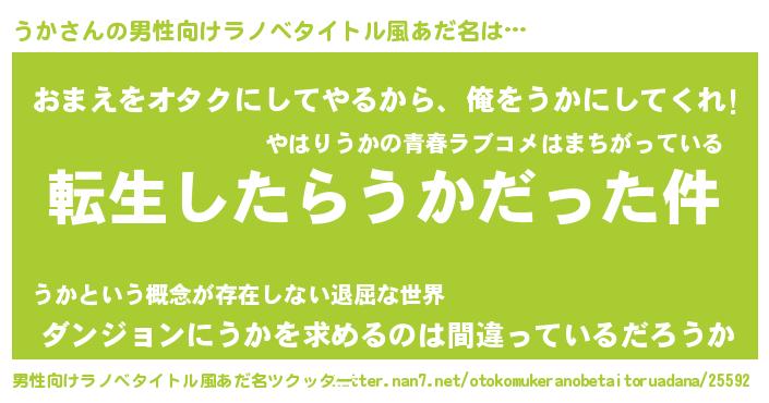 | ヒーロー風カッコイイあだ名 | 『慈愛の使者うか』『炎刃騎士ウカ』 |