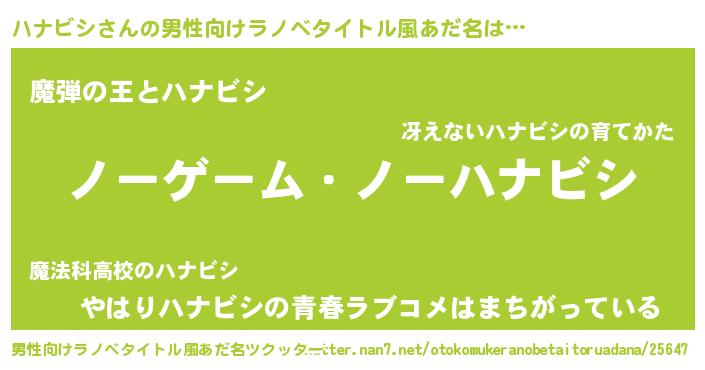 | 女子向けラノベタイトル風あだ名 | 『死神ハナビシの再婚』 |