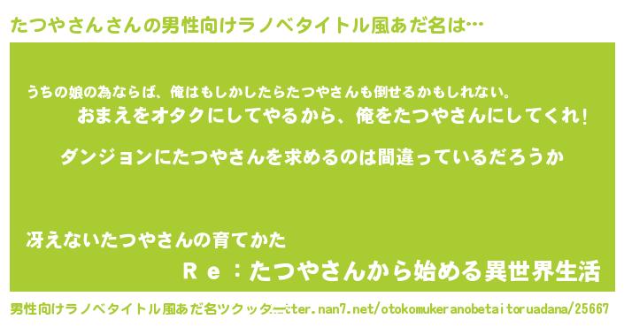 | 女子向けラノベタイトル風あだ名 | 『たつやさんは平凡を望む』 |