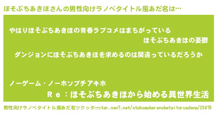| 女子向けラノベタイトル風あだ名 | 『ほそぶちあきほの卵を拾いまして』 |