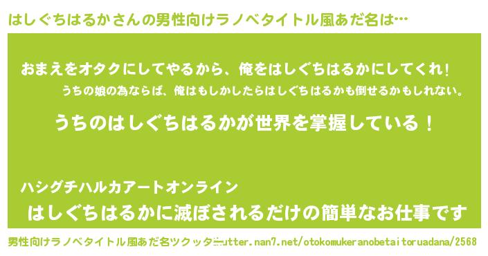 | 女子向けラノベタイトル風あだ名 | 『男装はしぐちはるかの憂鬱な任務』 |