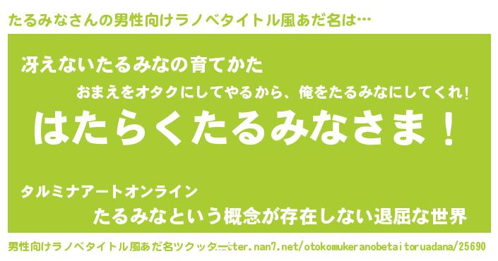 | 胡散臭い通販商品みたいなあだ名 | 『絶対に幸福をもたらす水素水…その名も「たるみな」』 |