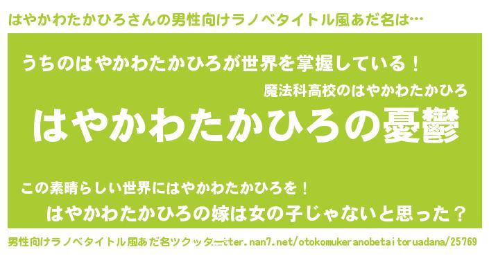 | 女子向けラノベタイトル風あだ名 | 『(仮)はやかわたかひろのやんごとなき事情』 |