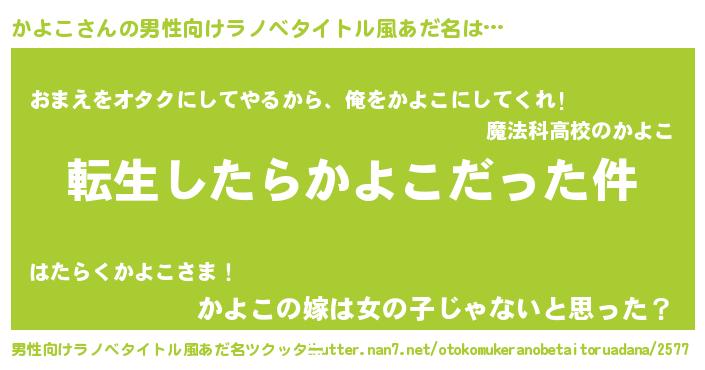 | 女子向けラノベタイトル風あだ名 | 『かよこの玉の輿計画!』 |