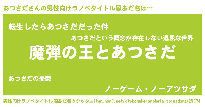 女子向けラノベタイトル風あだ名 | 『乙女ゲームの破滅フラグしかない悪役あつさだに転生してしまった…』 |