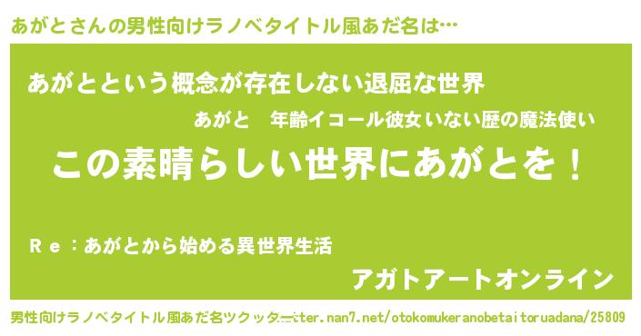 | 意味不明あだ名 | 『住所不定無職あがと(2歳)』『自称あがと』 |