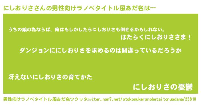 | 胡散臭い通販商品みたいなあだ名 | 『信頼と実績のサプリメント…その名も「にしおりさ」』 |