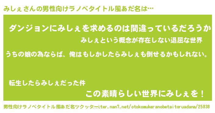 | 女子向けラノベタイトル風あだ名 | 『みしぇの婚約者』『みしぇは平凡を望む』 |