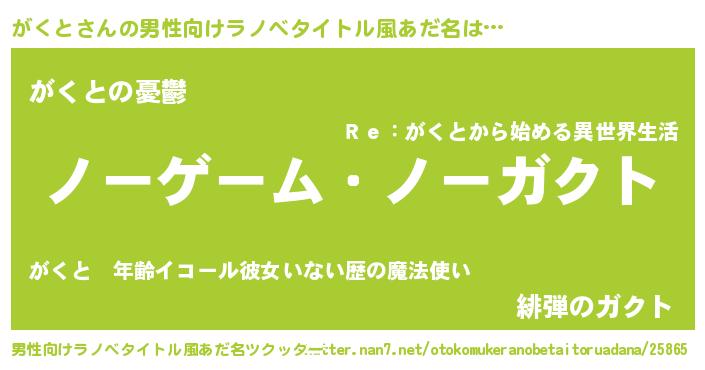 | 女子向けラノベタイトル風あだ名 | 『死神がくとの再婚』『闇のがくと』 |