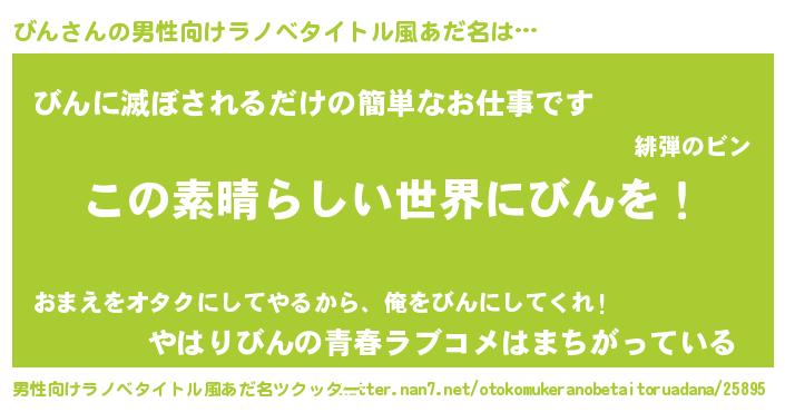 | 女子向けラノベタイトル風あだ名 | 『悪役びんに転生したようですが、知った事ではありません』 |