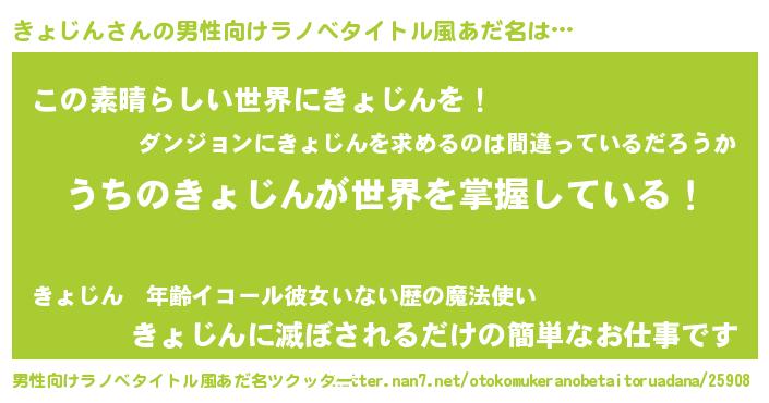 | 胡散臭い通販商品みたいなあだ名 | 『あなたにだけ特別に提供する限定10本のレアな日本酒…その名も「きょじん」』 |