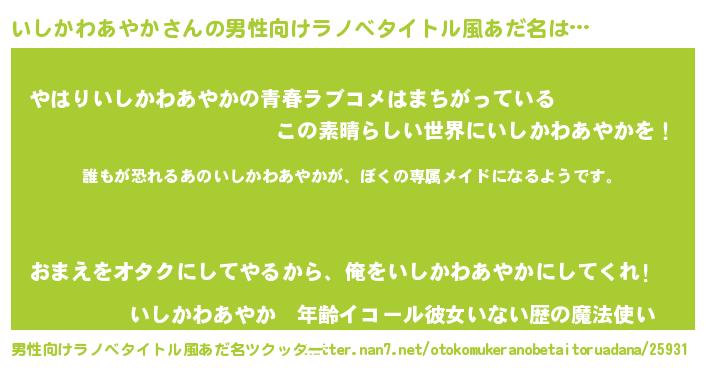 | 女子向けラノベタイトル風あだ名 | 『いしかわあやかの契約王妃』 |