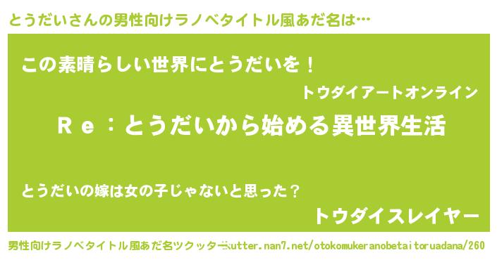 | ヒーロー風カッコイイあだ名 | 『最強戦士トウダイ』『仮面トウダー』 |