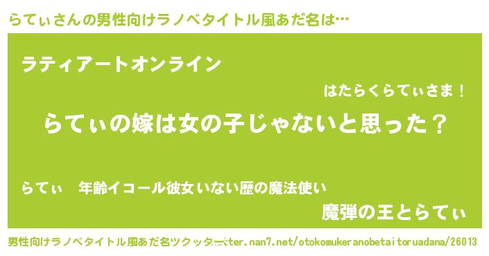| 女子向けラノベタイトル風あだ名 | 『らてぃの卵を拾いまして』 |