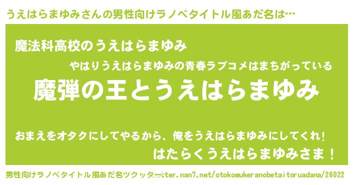 | 女子向けラノベタイトル風あだ名 | 『うえはらまゆみが死なない童話 林檎のうえはらまゆみの診療簿』 |
