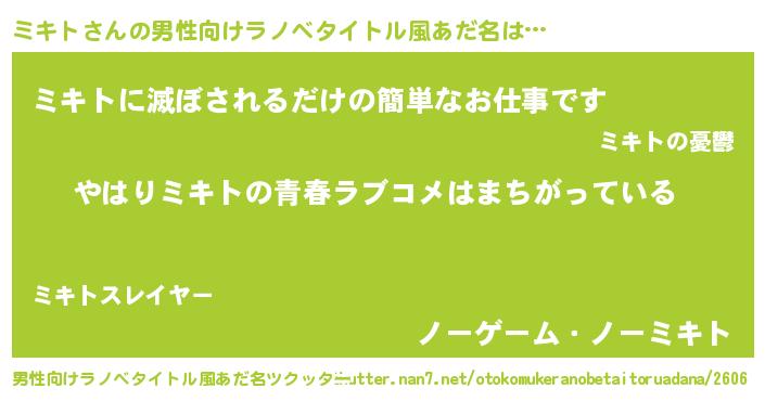 | 女子向けラノベタイトル風あだ名 | 『ミキト伯爵の花嫁』『死神ミキトの再婚』 |