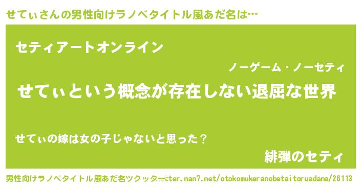 | 女子向けラノベタイトル風あだ名 | 『せてぃの契約王妃』『死神せてぃの再婚』 |
