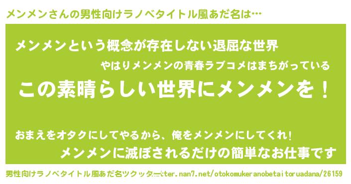 | 女子向けラノベタイトル風あだ名 | 『悪役メンメンに転生したようですが、知った事ではありません』 |
