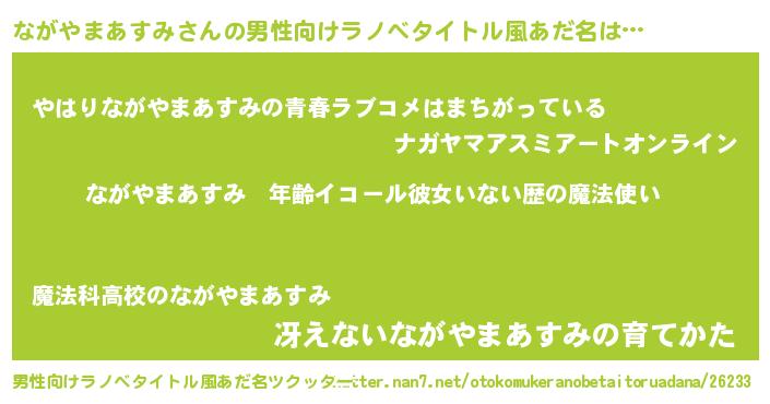 | 女子向けラノベタイトル風あだ名 | 『ながやまあすみの玉の輿計画!』 |